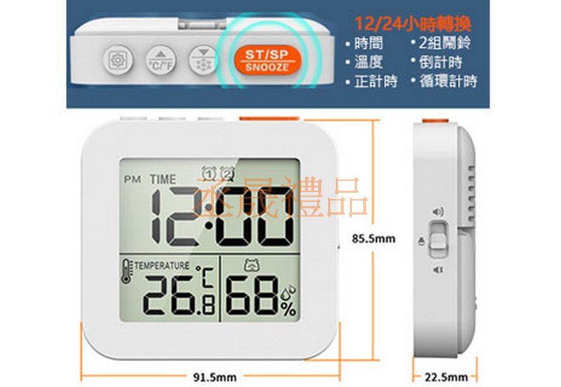 產品資訊: 12/24小時轉換,賴床新寵,一鍵貪睡。 時間/2組鬧鈴/溫度 倒計時/正計時/循環計時 背光燈功能 華度/攝氏度轉換 溫度、鈴聲大聲-小聲-靜音設置、貪睡功能 倒計時時範圍:99小時59分59秒 2節AAA電池供電 牛皮紙盒尺寸:11.2x3x9.1 CM 安全證書:CE/FCC